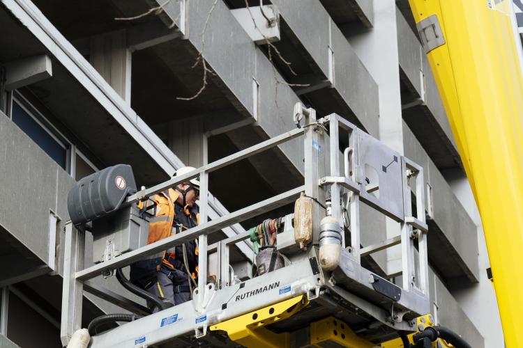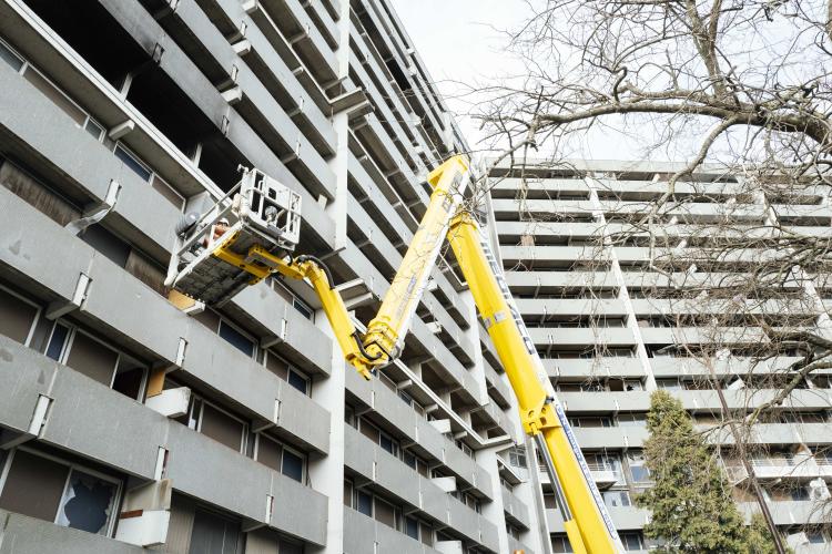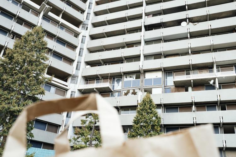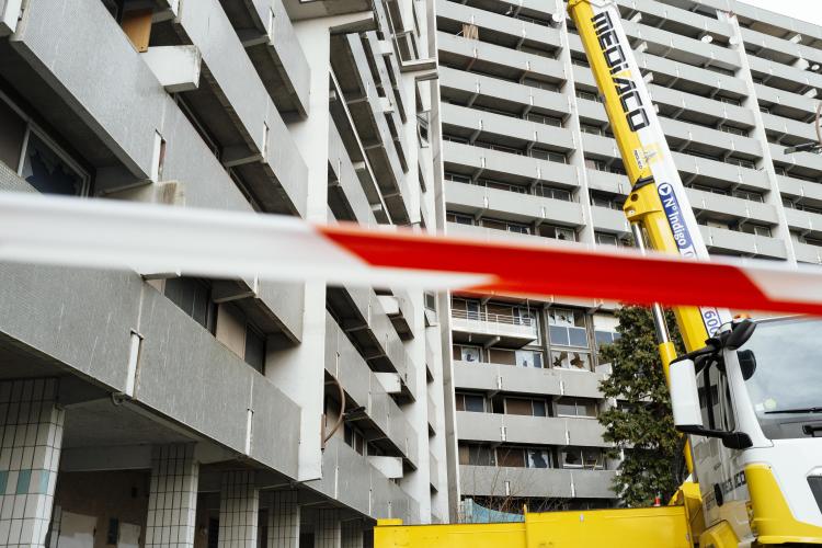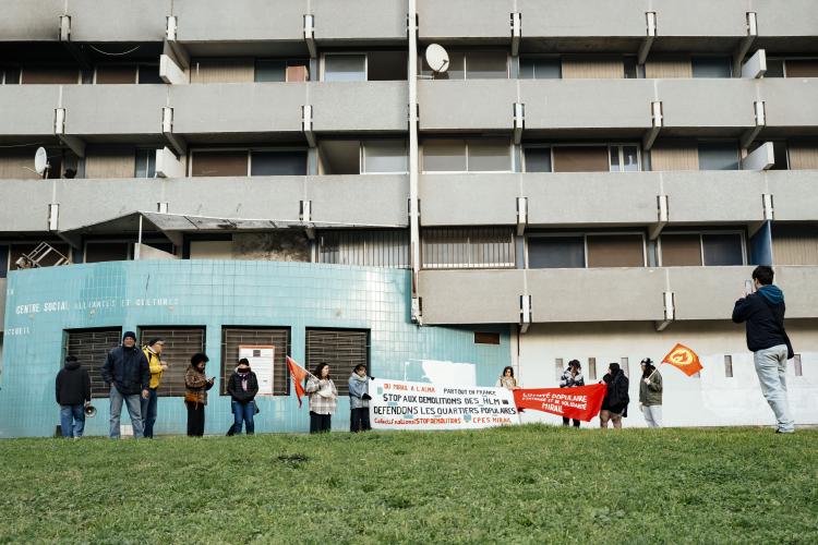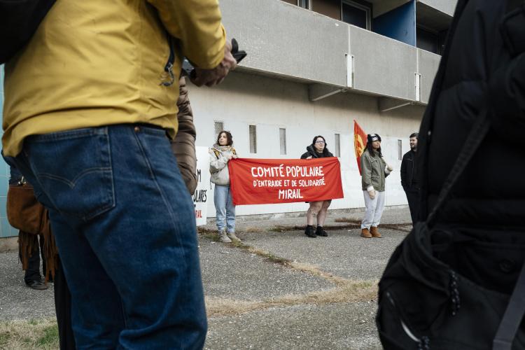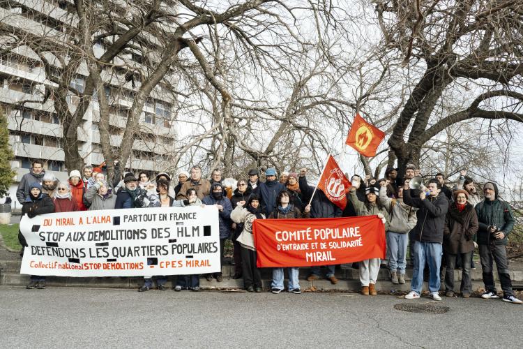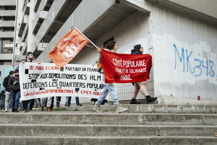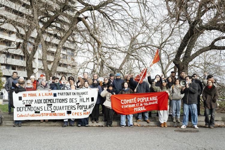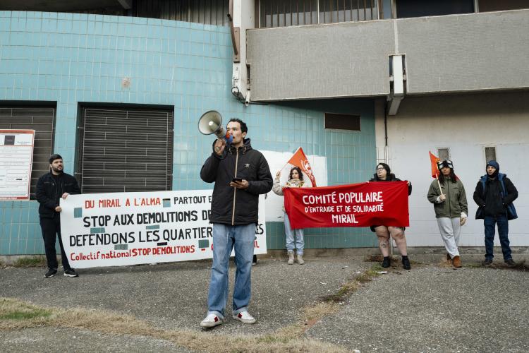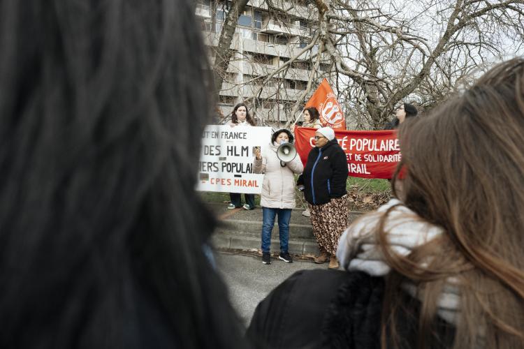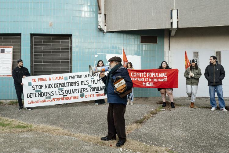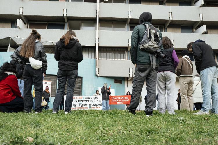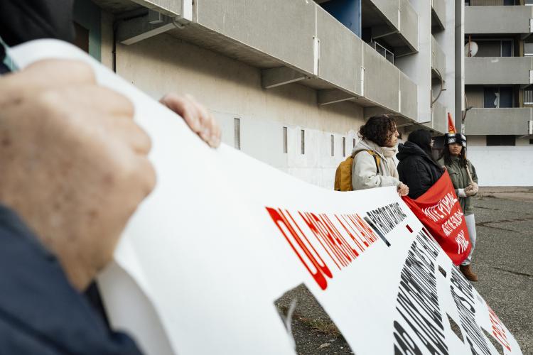 Mobilisation afin d obtenir un moratoire contre la demolition de l immeuble Messager de Candilis au Mirail jusqu aux elections municipales pour avoir le temps de demander a tous les candidats ainsi que les elus en place pour qu ils prennent en compte le probleme du logement, organise par le CPES Mirail (Centre Populaire d Entraide et de Solidarite) et le Collectif national Stop Demolitions en presence d habitants et habitantes, en presence de Maxime Le Texier (candidat Archipel) et de Mr Michel Retbi (architecte). Face a une penurie de logements ou des personnes finissent a la rue, une habitante temoigne : on a des logements qui sont la, qui sont immediatement utilisables avec une rehabilitation legere pour permettre de mettre a l'abri des familles qui sont dans l'attente de logements. France, Toulouse, Mirail, quartier Reynerie le 12 janvier 2026.